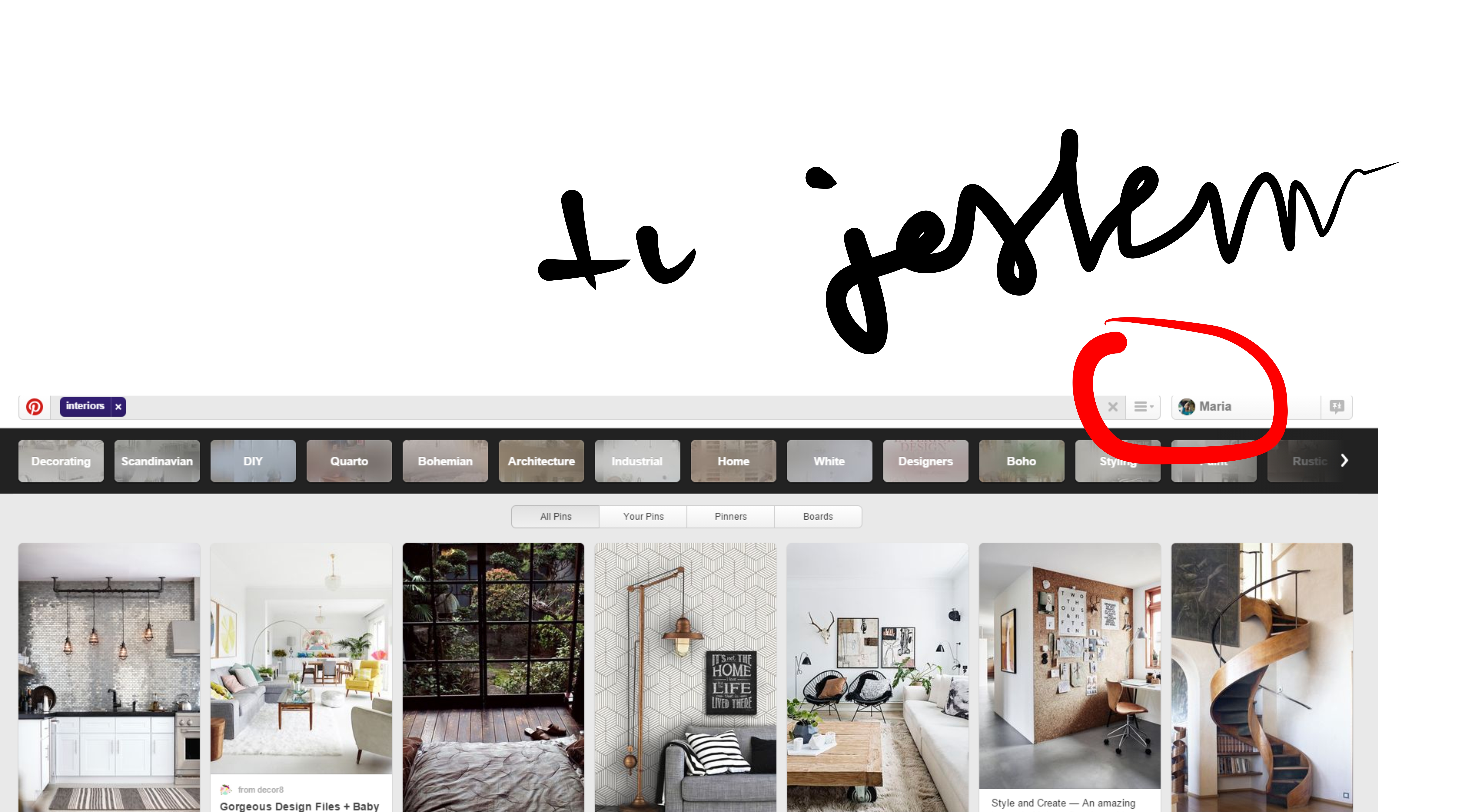 Rozmawiając z klientami okazało się, że owszem, korzystają z niego osoby pracujące w branży kreatywnej, ale wiele osób nie zna go i jeszcze i nie wie, czemu może on służyć. A przecież to takie genialne! Pracując nad projektem (albo kilkoma na raz) tworzymy tablice inspiracji. Możemy zrobić to w sposób tradycyjny, przypinając pinezkami do tablicy zdjęcia, wycinki z gazet i magazynów, by w końcu w naszej głowie narodziła się spójna wizja wnętrza. Taka tablica może zawisnąć w naszym domu, biurze. Swoje pomysły mogą przypinać do niej wszyscy zaproszeni do zabawy goście… ale zaraz, ja przecież piszę o Pintereście! Jeśli nie macie miejsca na korkowe i inne tablice możecie to wszystko zrobić w Internecie. Każde znalezione zdjęcie, które się Wam spodoba i zainspiruje Was przypinacie sobie pinezką do określonej tablicy np. o nazwie “Moja wymarzona sypialnia”. W sypialni mogą spać dwie osoby. Dlatego co robię? Wysyłam swojemu mężowi zaproszenie do tablicy, a niech sobie przypnie to, co się mu podoba. Może nawet skomentować, że nasza tablica jest świetna i on nie miał racji wybierając wściekle czerwone ściany do naszej oazy odpoczynku. Możemy również pójść dalej, odnajdując osoby, które są twórcze, mają świetny gust i przepiąć sobie ich tablice. A jeszcze prościej jest określić swoje preferencje – co nas interesuje i jakich zdjęć ma nam wyszukać sam Pinterest. Jeśli tego nie znacie i nie bawicie się tym to naprawdę must have jeśli chodzi o inspirowanie się.