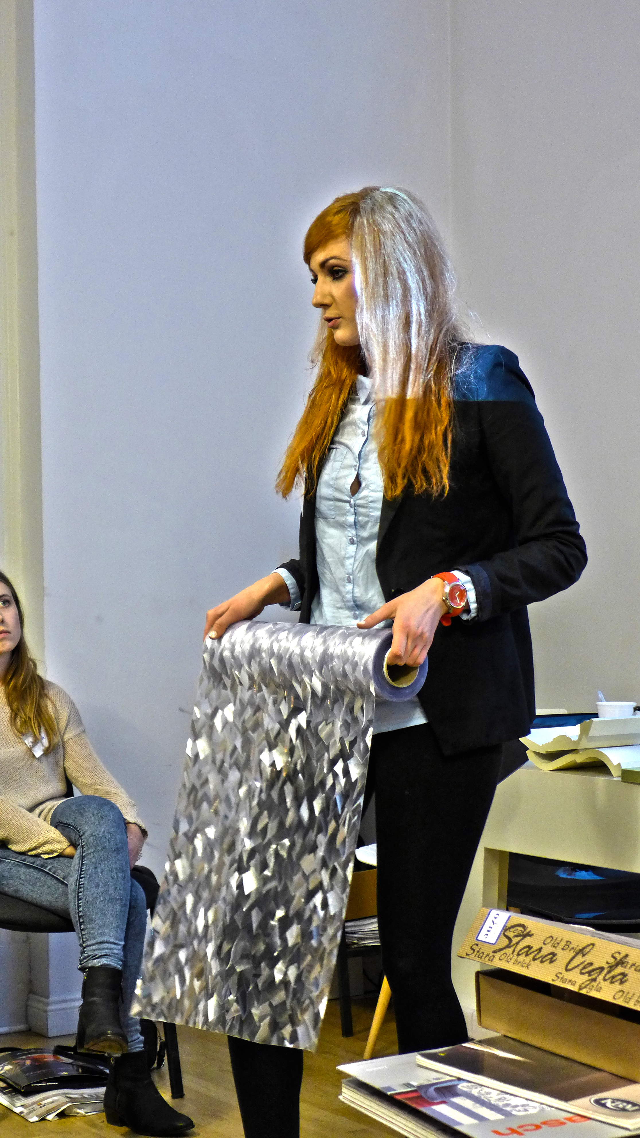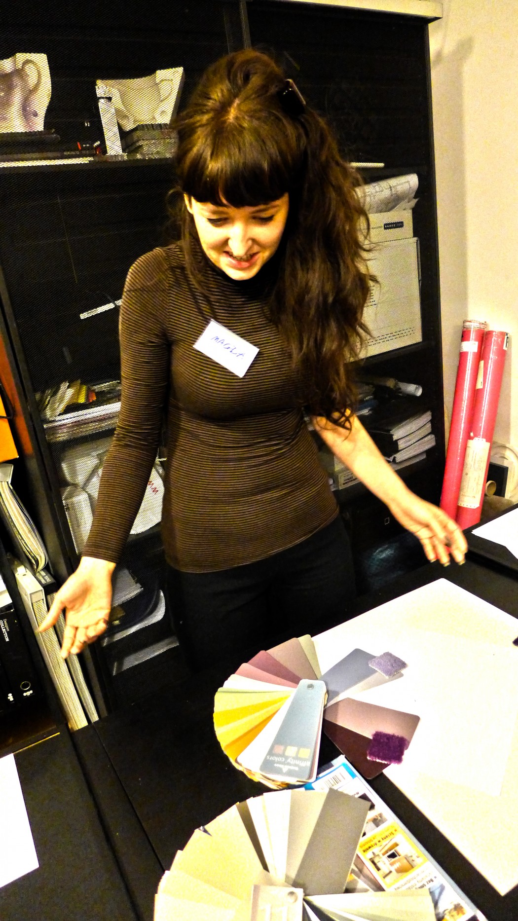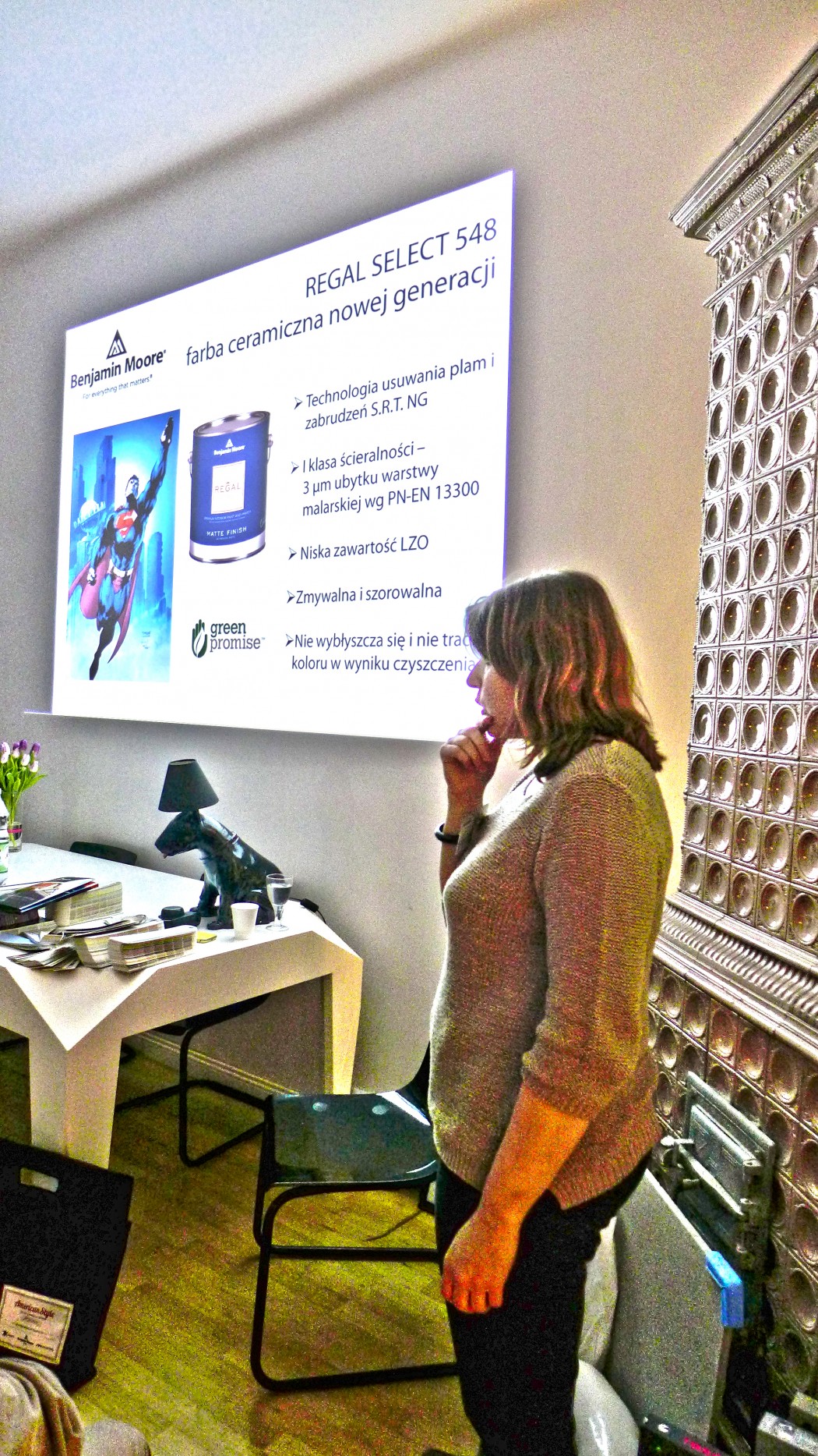 Partnerem Warsztatów został również Tapetowy Market. Pani Aneta Natkowska z Tapetowego Marketu przedstawiła naszym słuchaczom ofertę salonu, w którym oprócz tapet możecie znaleźć miękkie panele ścienne Fluffo, starą cegłę, beton architektoniczny, farby Benjamin Moore, sztukaterię Creativa oraz coś zupełnie jeszcze nieznanego, a bardzo pomysłowego – folię statyczną Lineafix. Oprócz produktów dostępnych w tapetowym markecie mogliśmy się od Pani Anety dowiedzieć wszystkiego o tapetach.