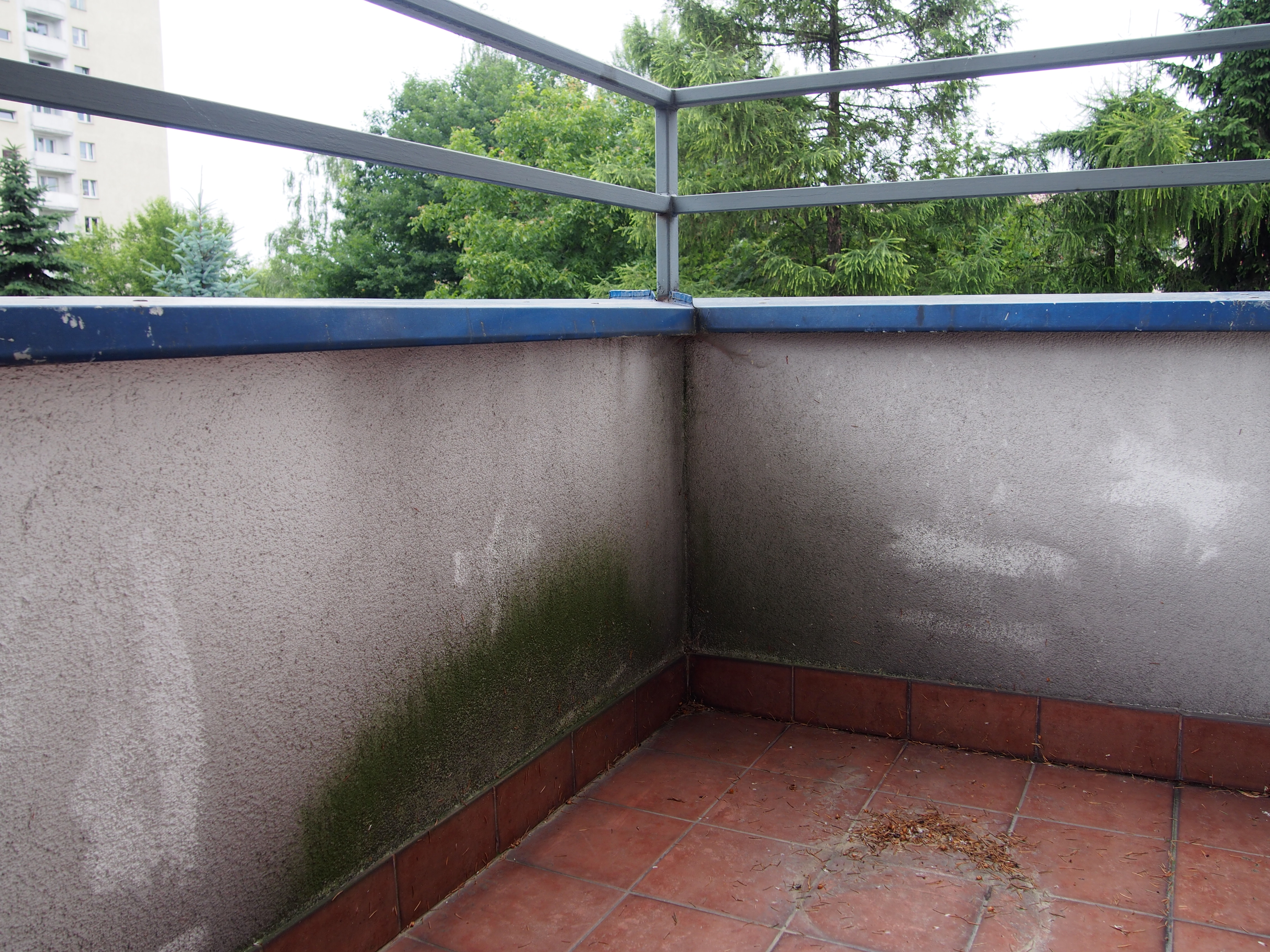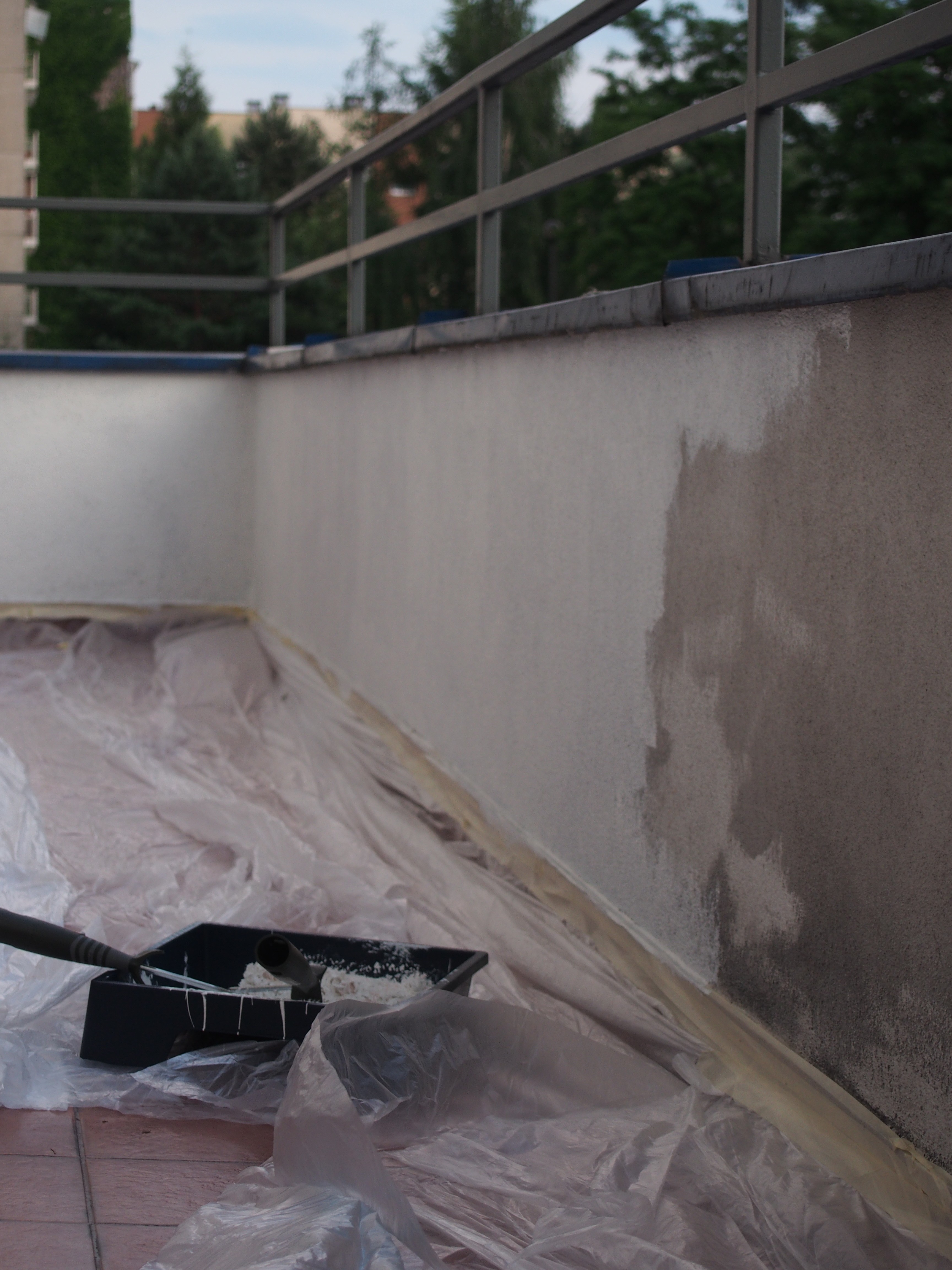 Aby metamorfoza się udała postanowiliśmy również odświeżyć ściany – przynajmniej te, które nie wchodzą w skład elewacji całego budynku, a należą tylko do nas. Najpierw więc dzielnie usunęliśmy (ja i mój mąż) mchy i porosty, które zadomowiły się na naszych ścianach, zagruntowaliśmy powierzchnię i dwukrotnie pomalowaliśmy na biało wszystkie trzy ściany tworzące balkon. To wszystko by stworzyć przyjemny klimat i podkreślić piękne deski, które zamierzaliśmy położyć na balkonie.