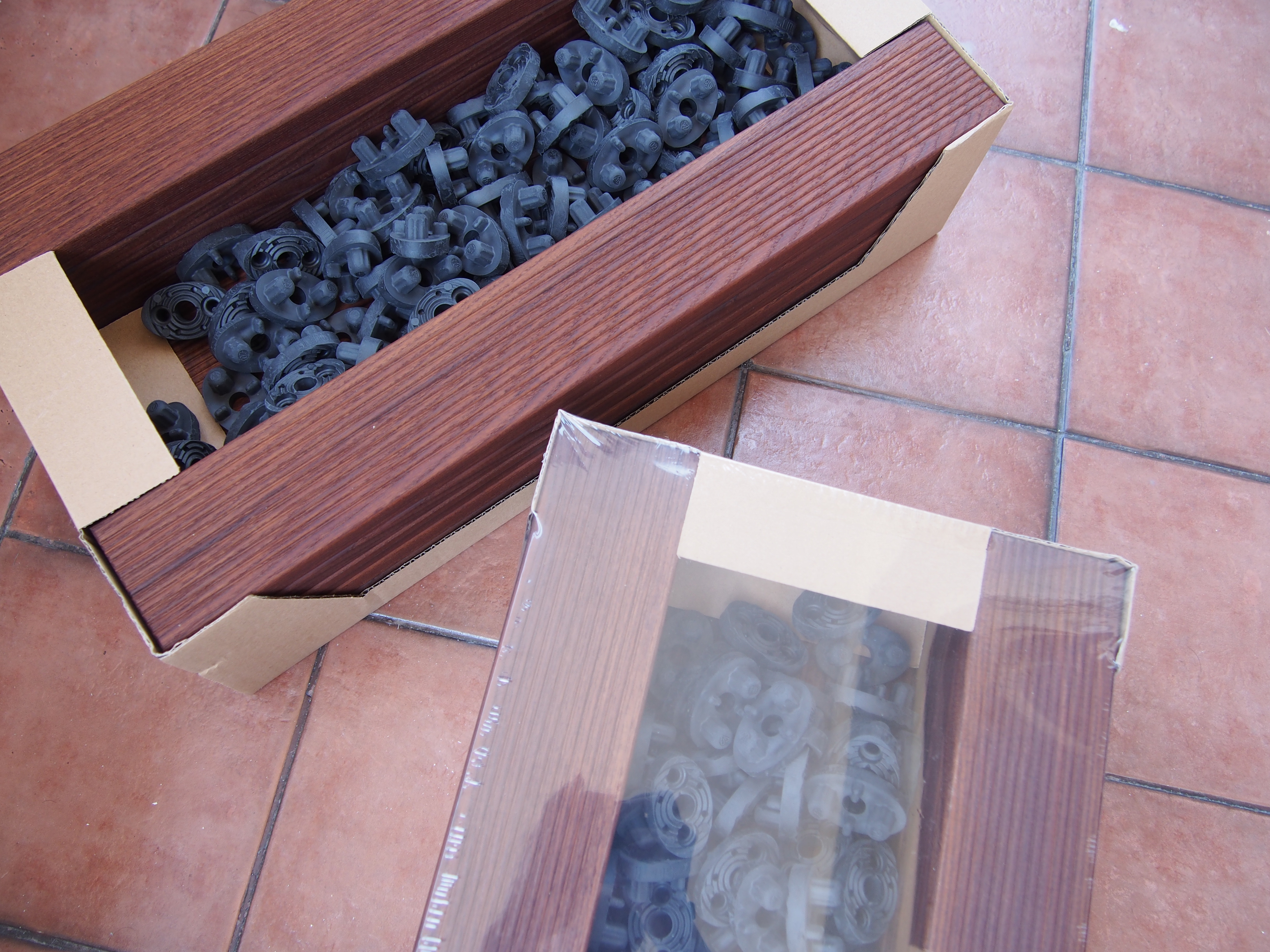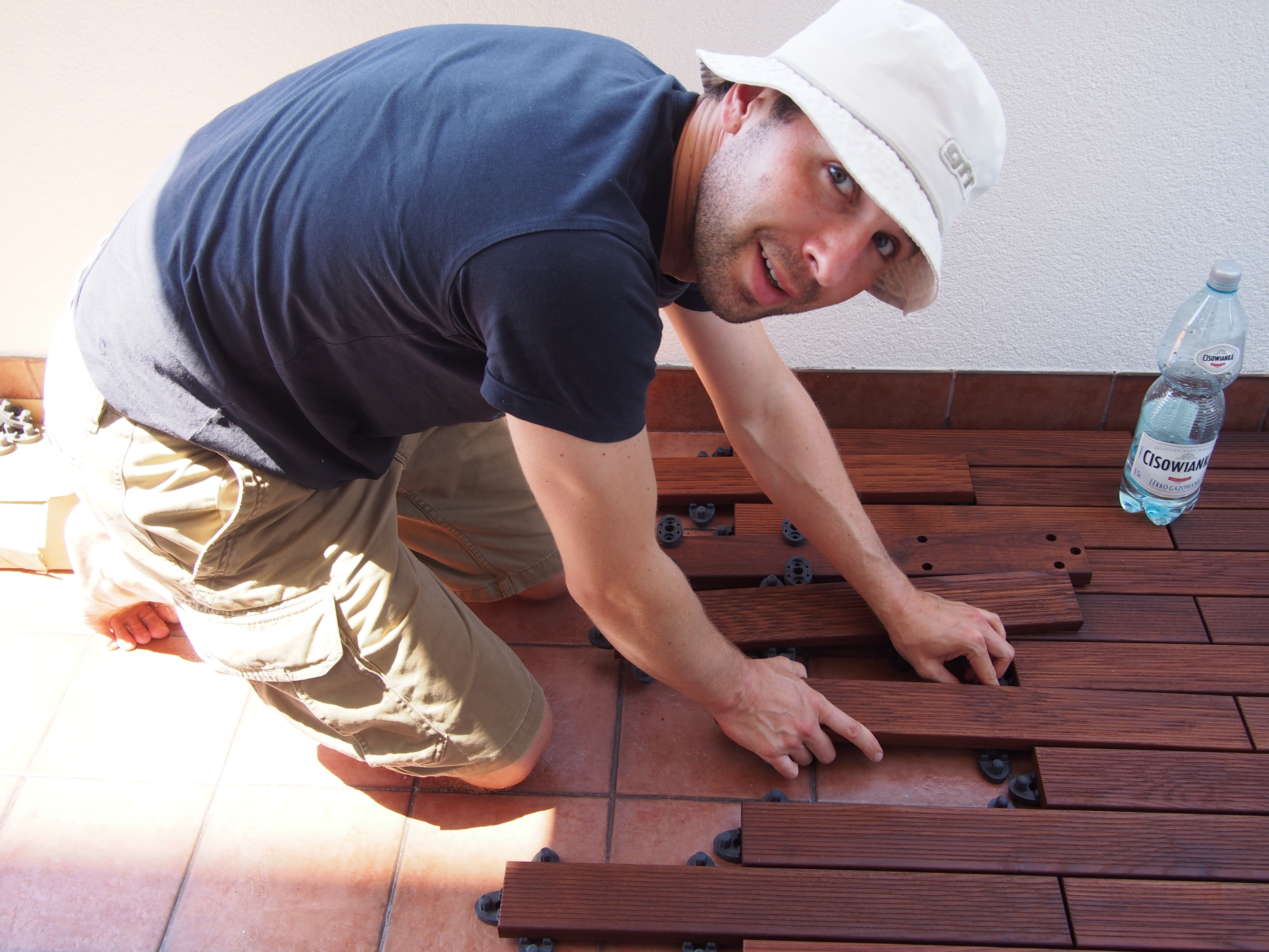 I w końcu wczoraj w największym słońcu (balkon mamy od strony południowej) zabraliśmy się za układanie desek gumitaras. Zabawy było przy tym co nie miara i humory nam dopisywały.