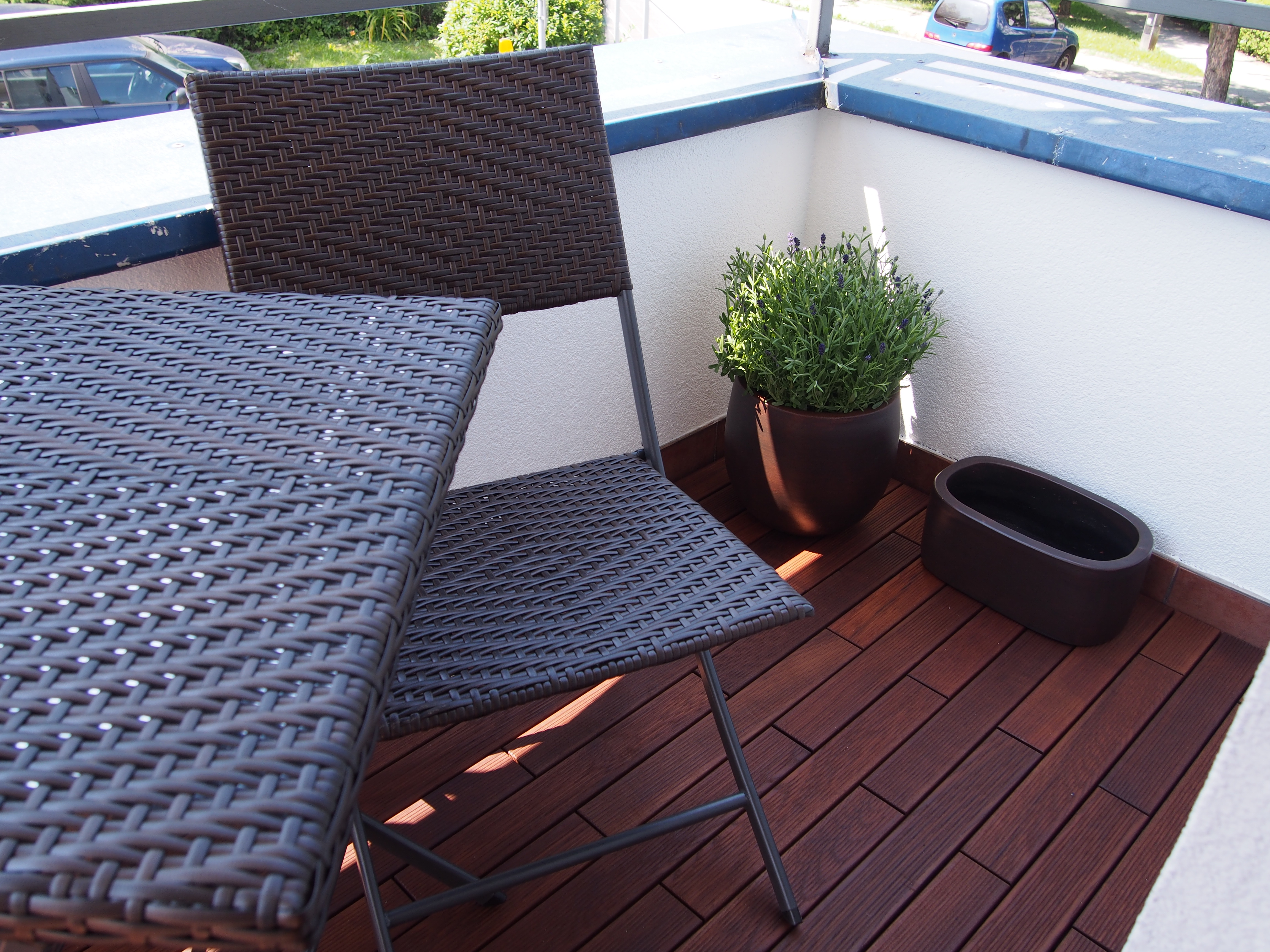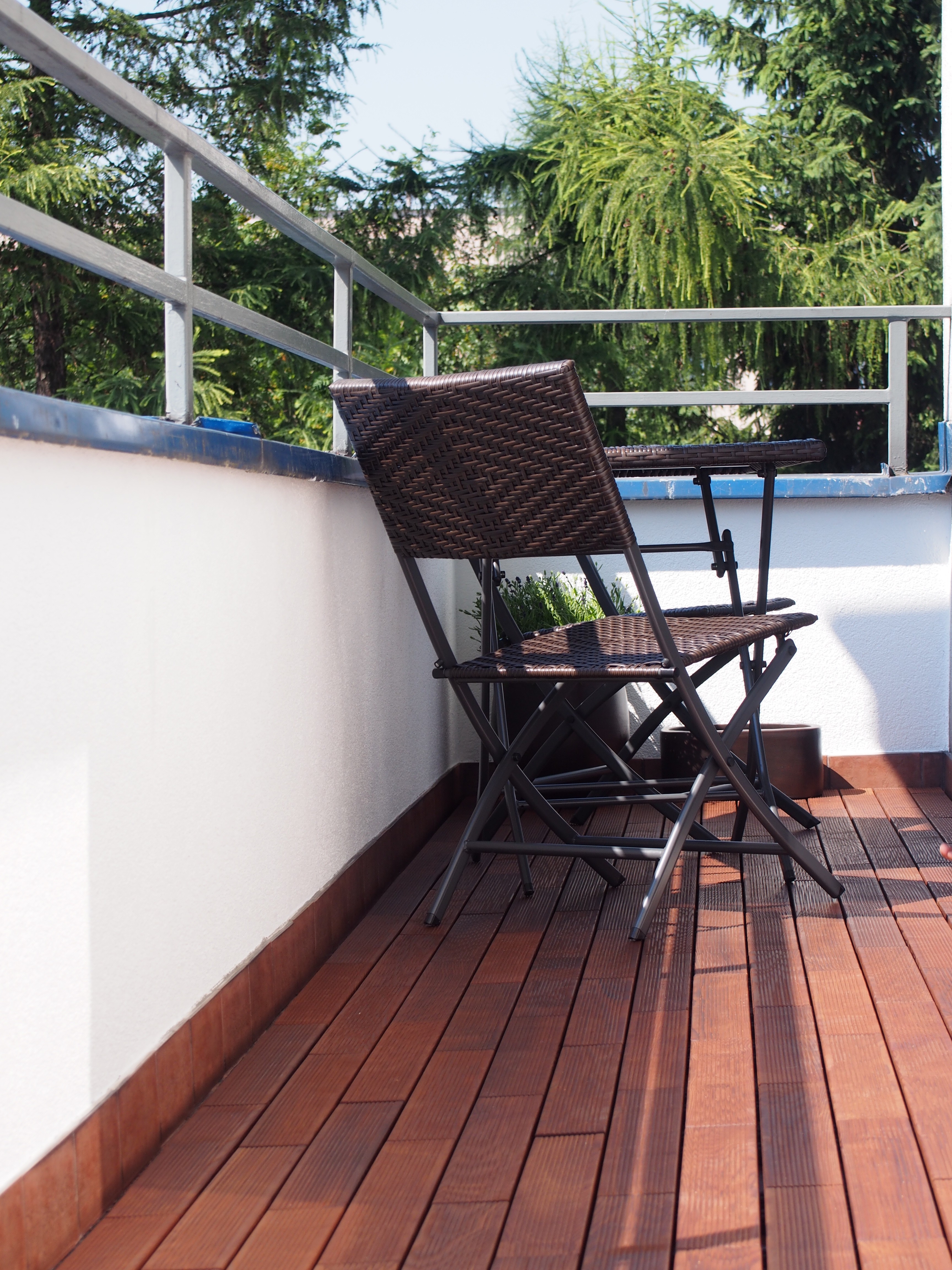 Ułożenie desek tarasowych na naszym balkonie (10m2) zajęło nam nieco ponad 3 godziny. W pełnym słońcu, z pełną motywacją, by zrobić to jak najszybciej i udać się na zasłużony odpoczynek. I udało się! Po tych kilku godzinach nasz balkon jest nie do poznania! A to dopiero początek metamorfozy! Kupiliśmy na razie stoliczek, 2 doniczki i jedną roślinkę. Kolejnym etapem będzie przyozdobienie ściany elewacyjnej wiklinową matą – niestety tej części ściany nie dało się przemalować, trzeba ją więc czymś przysłonić – oraz zakup kolejnych roślinek, latarenek i innych dekoracyjnych gadżetów. Myślę, że efekt jest zdumiewający i że nie jedna osoba marzy o pięknych naturalnych deskach na swoim tarasie. Jak sami widzicie to nie takie trudne – wystarczy kilka dni pracy, a Wasz balkon może przemienić się z odstraszającej przestrzeni w całkiem przyjemny i zachęcający do przesiadywania na nim godzinami kącik. I tym optymistycznym akcentem uciekam powoli wypić soczek na moim balkonie, ale jeszcze Wam wrzucę kilka fotek jak to wygląda teraz. Co sądzicie? Jest różnica, prawda?