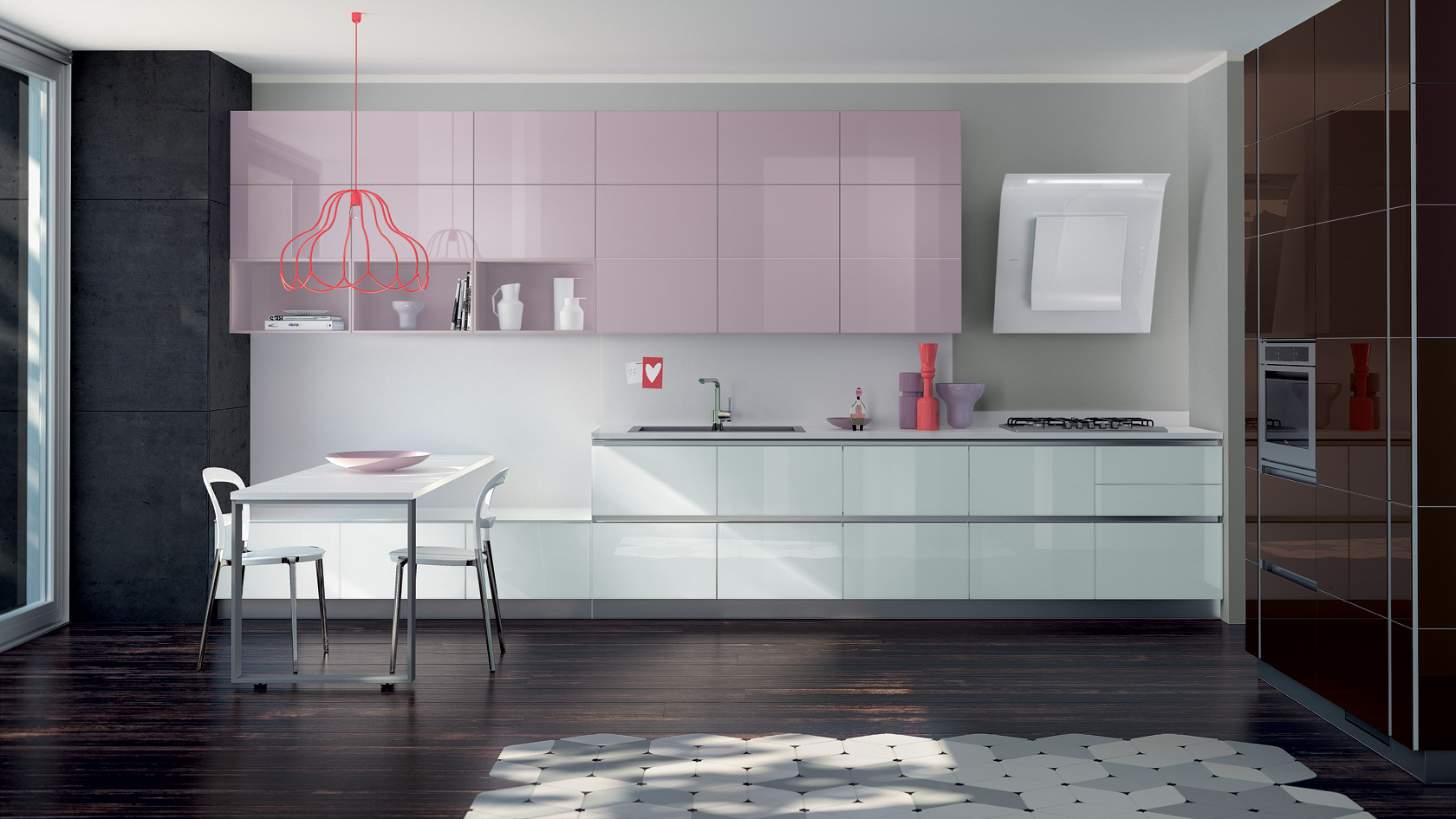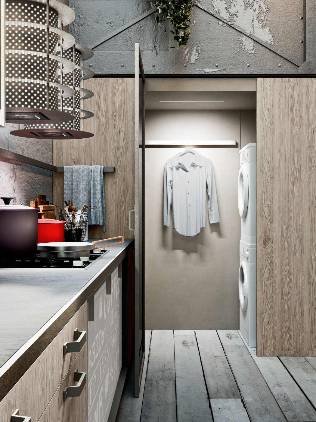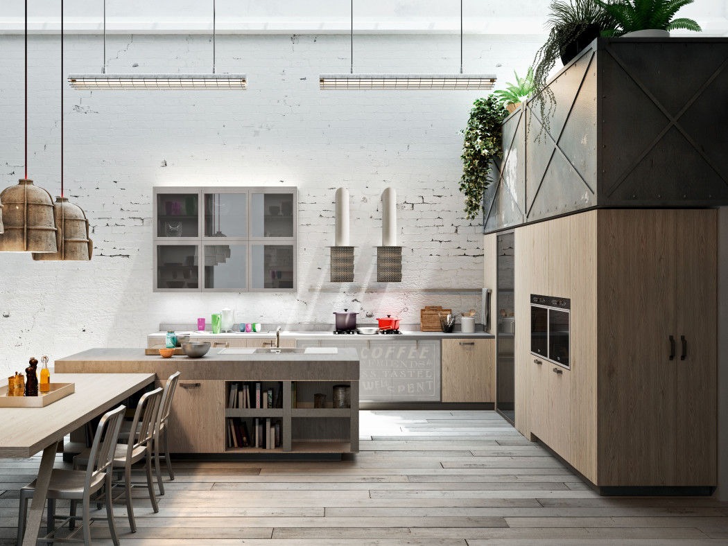 Code Evolution, Michele Marcon Design. Kuchnia jest wyrazem ostatnich trendów architektury miejskiej. Kompaktowe oraz solidne szafy oklejone laminatem imitującym drewno nadszarpnięte zębem czasu połączone, z materiałami takimi jak imitacja cementu, czy metalowe dodatki, w połączeniu z post-industrialnymi elementami przywodzą na myśl miejskie symbole. Pomimo dużej przestrzeni, na której kuchnia została zaprezentowana, jest ona dedykowana dla niewielkich powierzchni, dla ludzi młodych, miłośników stylu, jakości i mody.