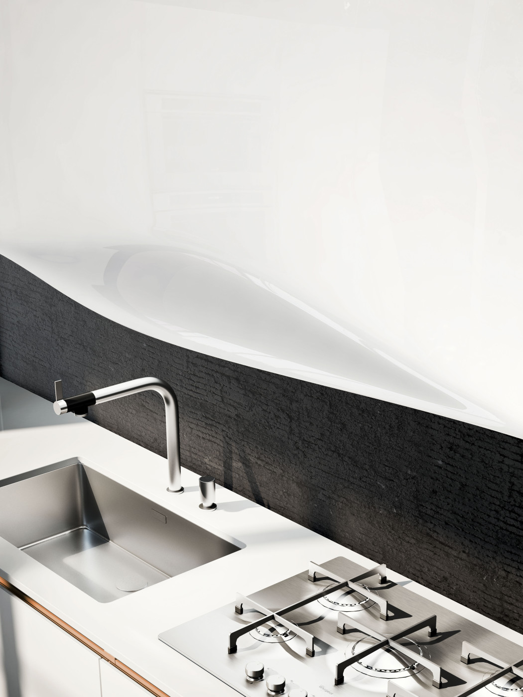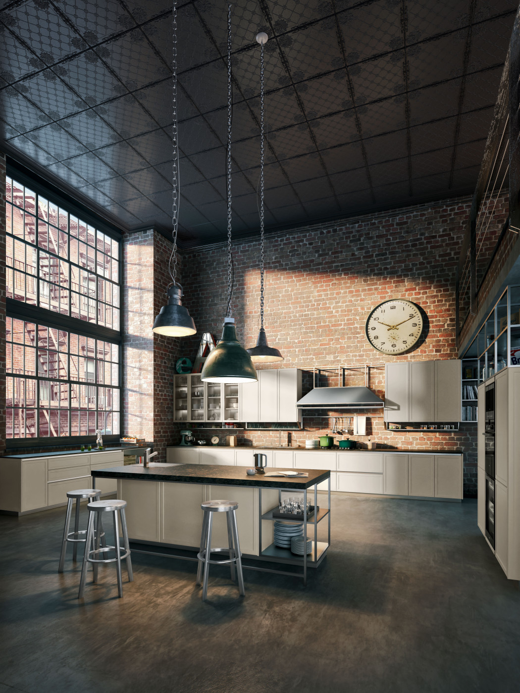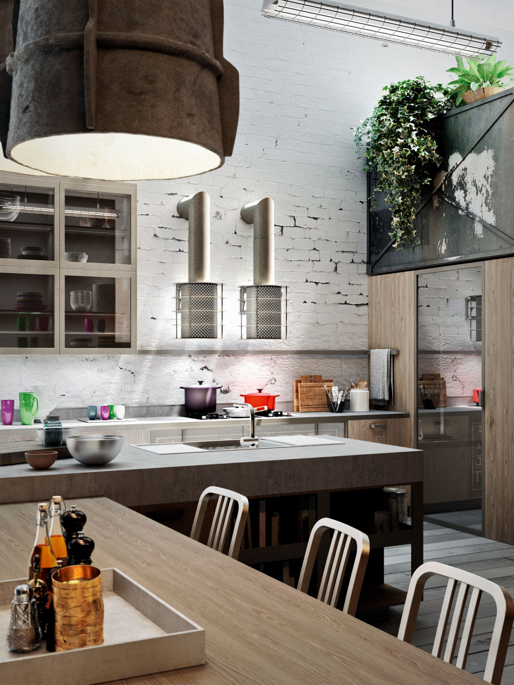 Code Evolution, Michele Marcon Design. Kuchnia jest wyrazem ostatnich trendów architektury miejskiej. Kompaktowe oraz solidne szafy oklejone laminatem imitującym drewno nadszarpnięte zębem czasu połączone, z materiałami takimi jak imitacja cementu, czy metalowe dodatki, w połączeniu z post-industrialnymi elementami przywodzą na myśl miejskie symbole. Pomimo dużej przestrzeni, na której kuchnia została zaprezentowana, jest ona dedykowana dla niewielkich powierzchni, dla ludzi młodych, miłośników stylu, jakości i mody.