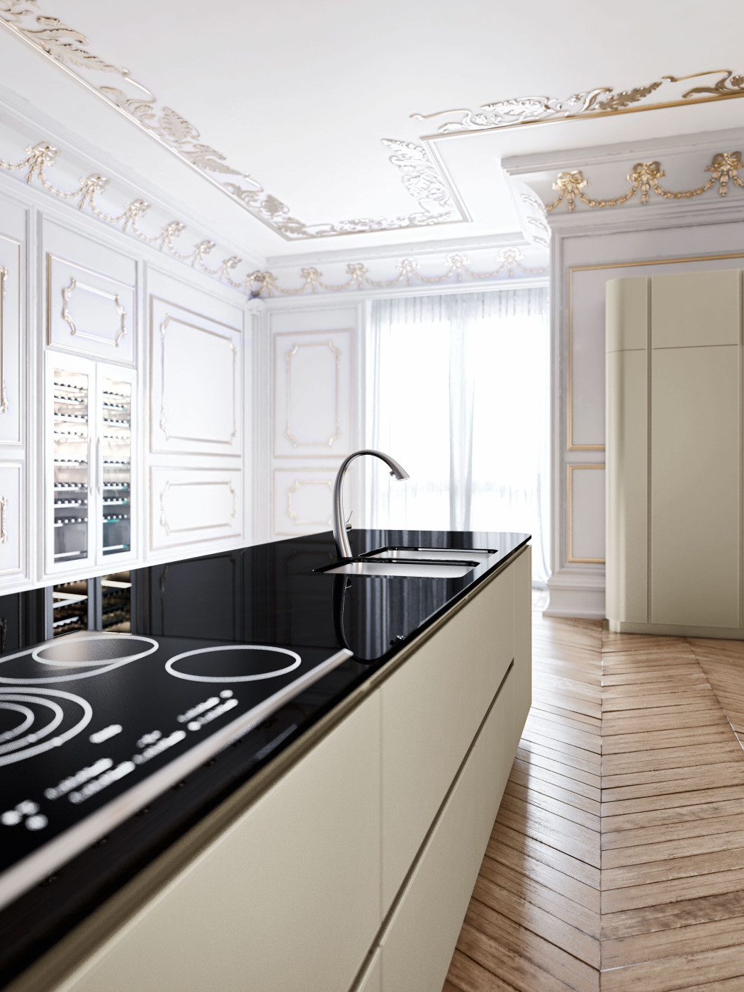 Kuchnia Synthia C|Ceres-C. Materiały i kolory kuchni podkreślają architekturę pomieszczenia. Dąb antyczny w widocznymi słojami, pęknięciami i namacalną teksturą nadaje kuchni naturalny wygląd.